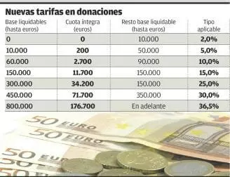 - Reducción en las tarifas. La nueva tabla se hará efectiva entre ascendientes, descendientes y cónyuges cuyo patrimonio preexistente no exceda de 402.678,11 €. Además, se rebaja el tipo de interés hasta el 2%, frente al 7% anterior. Se reduce el número de tramos, de 16 a 7.