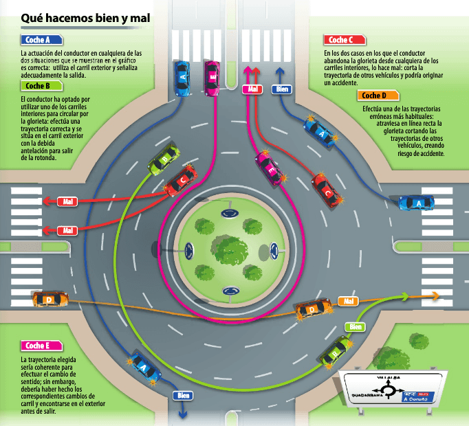 En una rotonda, el sentido del tráfico siempre será el contrario a las agujas del reloj. Además, rige siempre el principio de prioridad de la derecha. Es decir, aquellos que circulen por el carril exterior tendrán preferencia sobre el interior. Y los coches que esperan fuera de la rotonda deben ceder el paso a quienes ya estén circulando por ella. Salvo, por supuesto, en aquellas rotondas en las que exista señalización específica. En cuanto a los cambios de carril y cómo saber cuál elegir en función de la salida que vayamos a coger, en este gráfico encontramos una explicación sencilla: